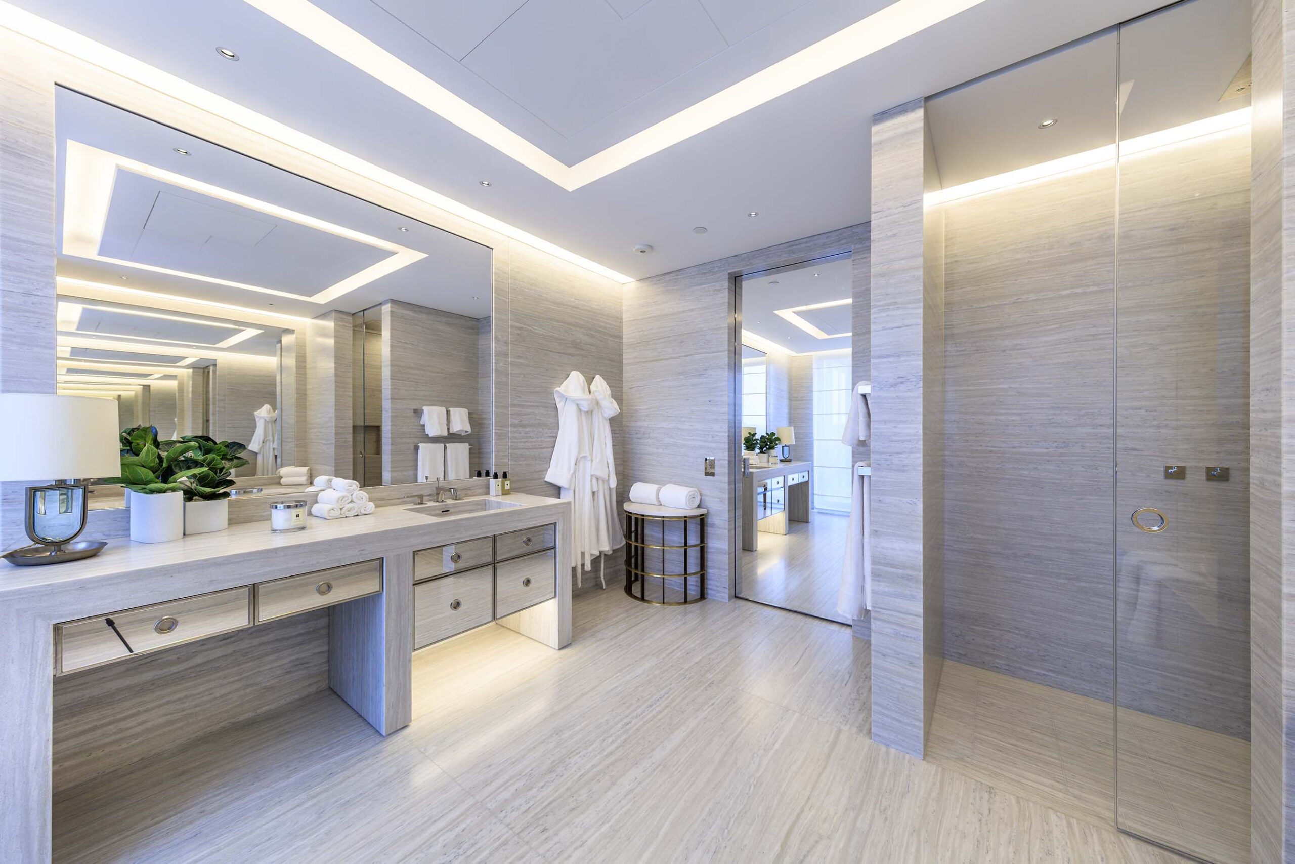 This luxury two-bedroom penthouse apartment was delivered to the highest standards, in close collaboration with the base-build architect. The interiors feature exquisite stone finishes throughout, showcasing craftsmanship of the finest quality.