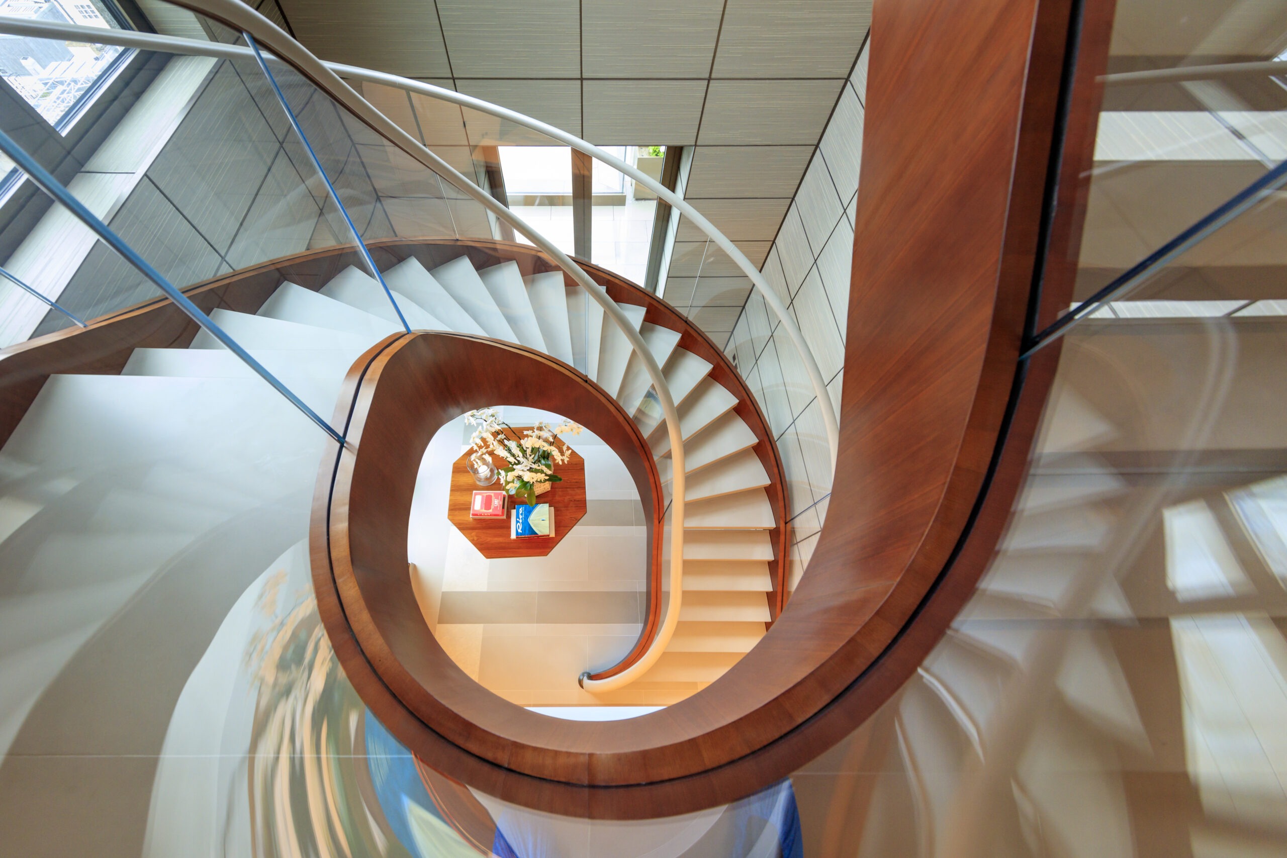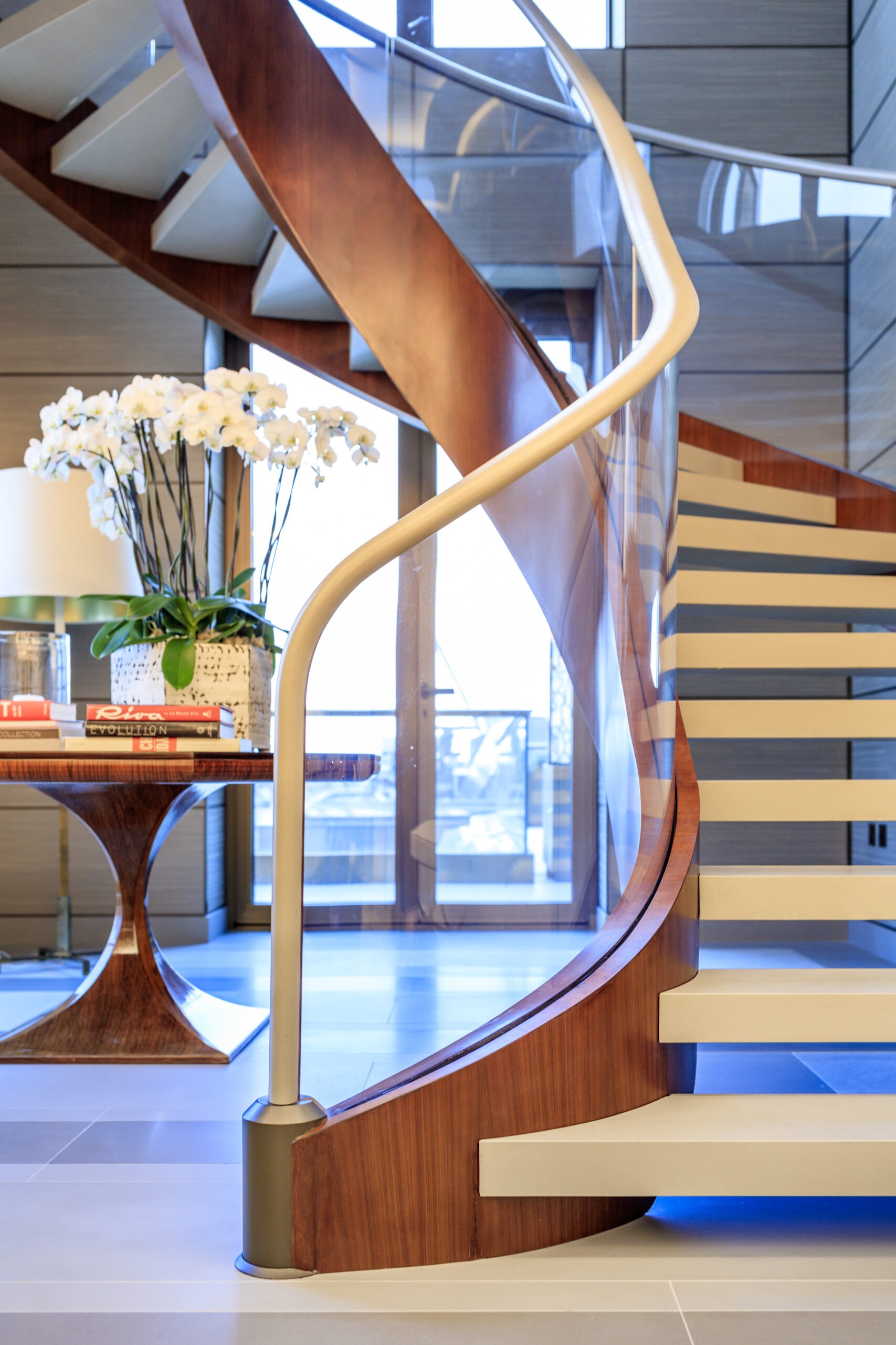 A striking staircase rises through the lobby, crafted with American walnut joinery, suede, and fabric wall panelling. At the heart of the living room, a dramatic floor-to-ceiling gas fire takes centre stage, framed by a bespoke Pierre Sabatier surround in a specialist finish.