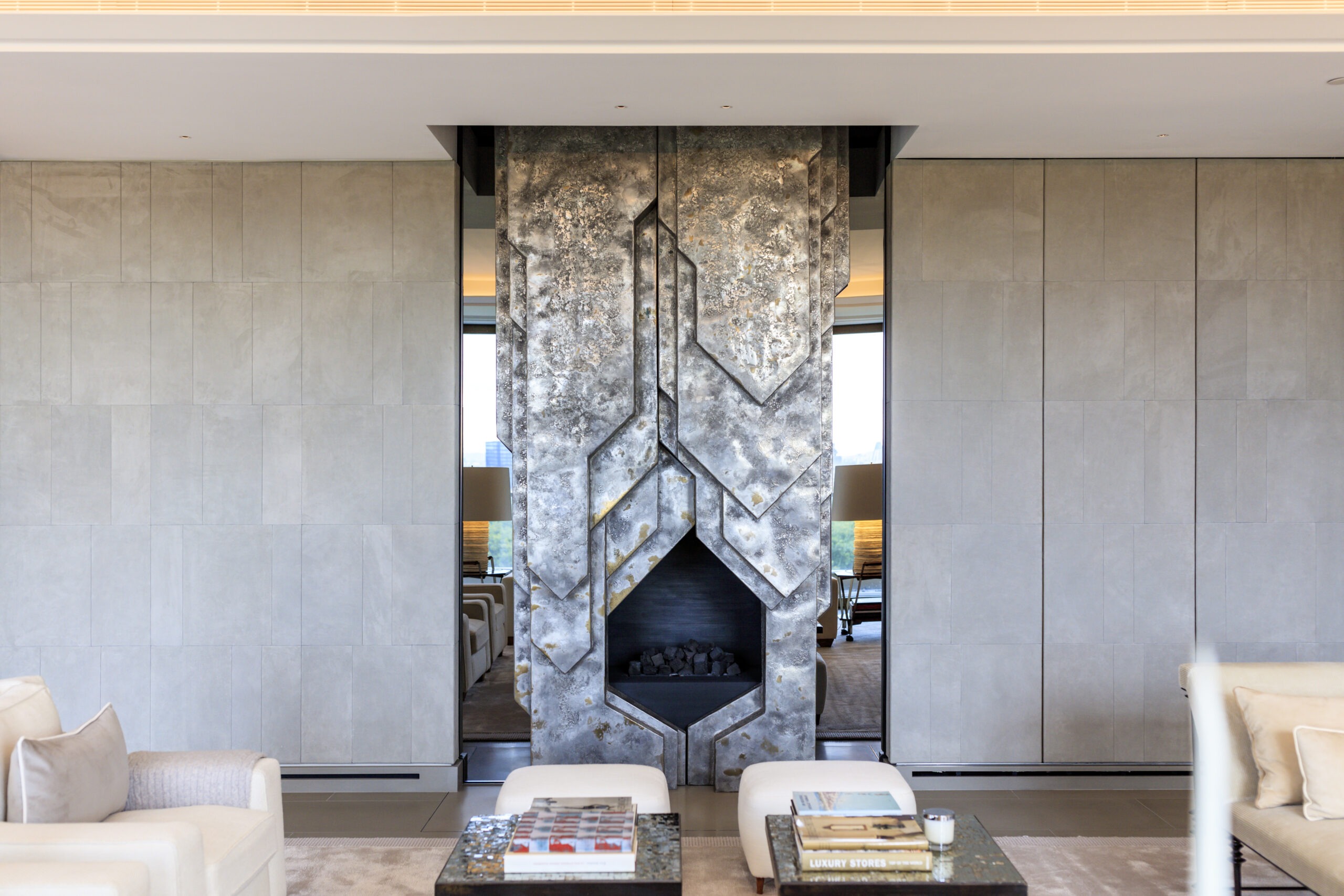 A striking staircase rises through the lobby, crafted with American walnut joinery, suede, and fabric wall panelling. At the heart of the living room, a dramatic floor-to-ceiling gas fire takes centre stage, framed by a bespoke Pierre Sabatier surround in a specialist finish.